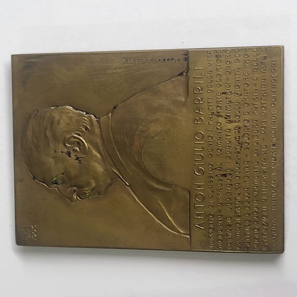 Bronze plaque signed "F de A 1906" commemorating Anton Giulio Barrili promoted by the Ligurian Association of Journalists, in original box. Measures approximately 45x64mm, excellent condition