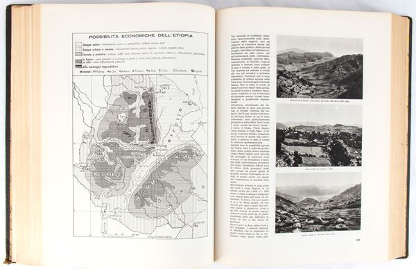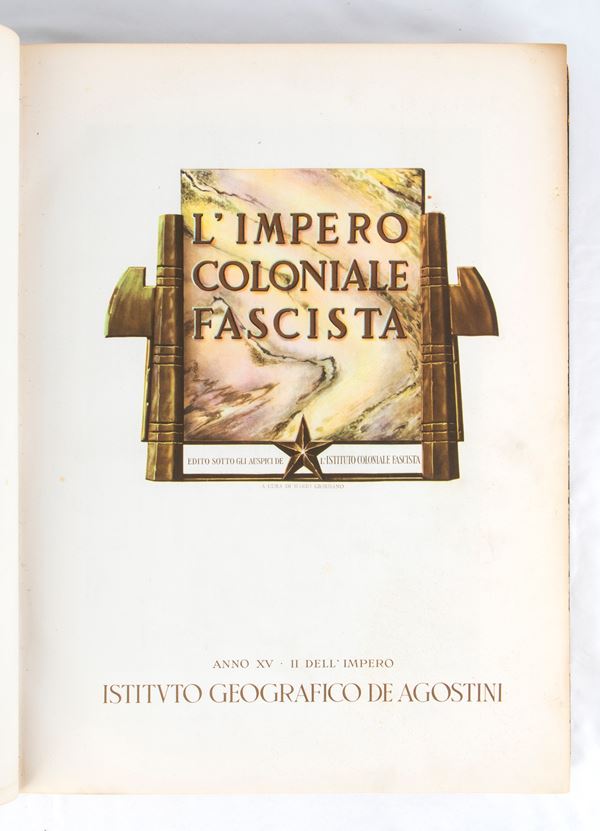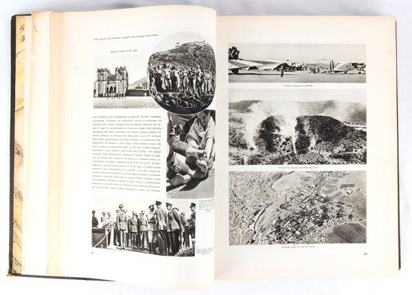 Monumental work edited by Mario Giordano, for the Istituto Geografico De Agostini Novara, first edition of 1936. Rich iconographic apparatus with physical-political maps, demonstrative maps, 4 color maps f.t. of which 3 folded, 3 full-page color plates with reproductions of paintings preserved in the Colonial Museum of Rome, numerous photographs. Four-color frontispiece. Hard cover, 568 pages. Measurements 41.5x32.5 cm