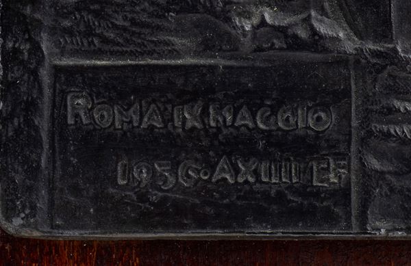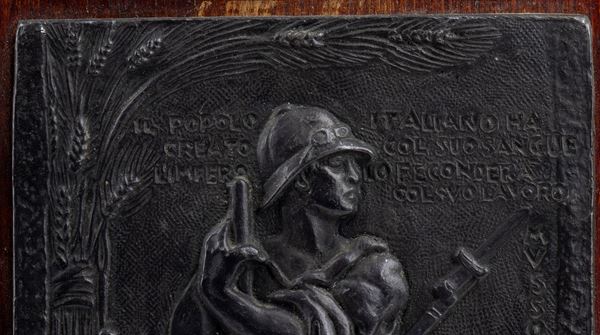 Plaque commemorating the foundation of the Empire in Africa in 1936. It depicts a soldier in a colonial uniform, armed with a musket and spade, with the inscriptions THE ITALIAN PEOPLE HAVE CREATED THEIR EMPIRE WITH BLOOD AND WILL FERTILIZE IT WITH WORK - MUSSOLINI - ROME 9 MAY 1936 A.XIIII E.F. (On May 9, Mussolini announced the foundation of the empire: Vittorio Emanuele III assumed the title of emperor of Ethiopia, while General Badoglio was appointed viceroy of Ethiopia and governor general of Italian East Africa). Plaque made of self-casting, originally mounted on a wooden base, bearing the original stamps on the back. FOR HIGHER ORDER THIS BAS-RELIEF IS CAST WITH SELF-RELIEF ZAMA METAL - WIN! - Gold medal. Approximate measurements of the plaque 10.5 x 17 cm, in excellent condition