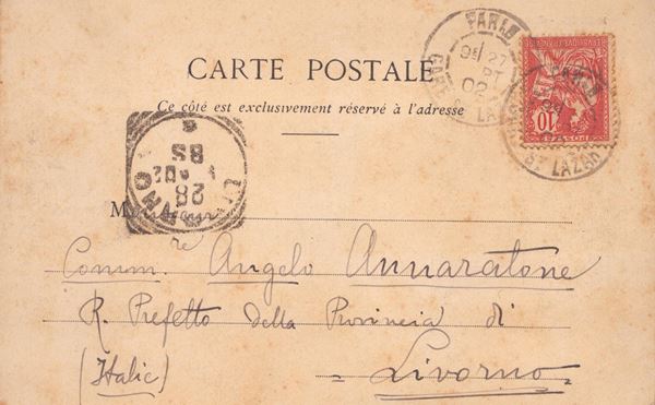 B/w postcard sent from Paris, Musée Carnavalet, with message and autograph signature by Pietro Mascagni, addressed to the Honorable Angelo Annaratone (former Garibaldi patriot and senator of the Kingdom of Italy) dated 26.9.902 - Measurements approximately 9x14 cm. stamped, stamped, in good condition