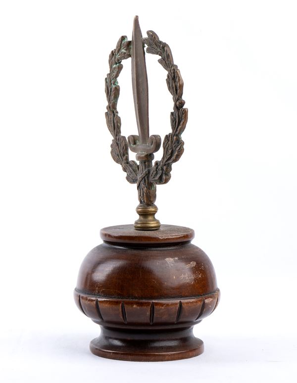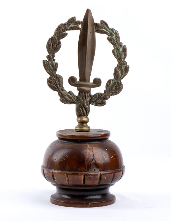 Flag tip for Arditi, Assault Department, in bronze, mounted on a turned wooden base. For banner or department flag. In excellent condition, original from the 1920s. The tip measures approximately 14 cm high