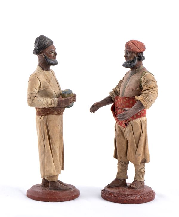 Pair of two hand-painted terracotta nativity scene characters, with fabric clothes, on a circular base. A gentleman bearing a gift, followed by his servant. Originals from the mid-19th century, probably oriental manufacture, very rare. In excellent condition