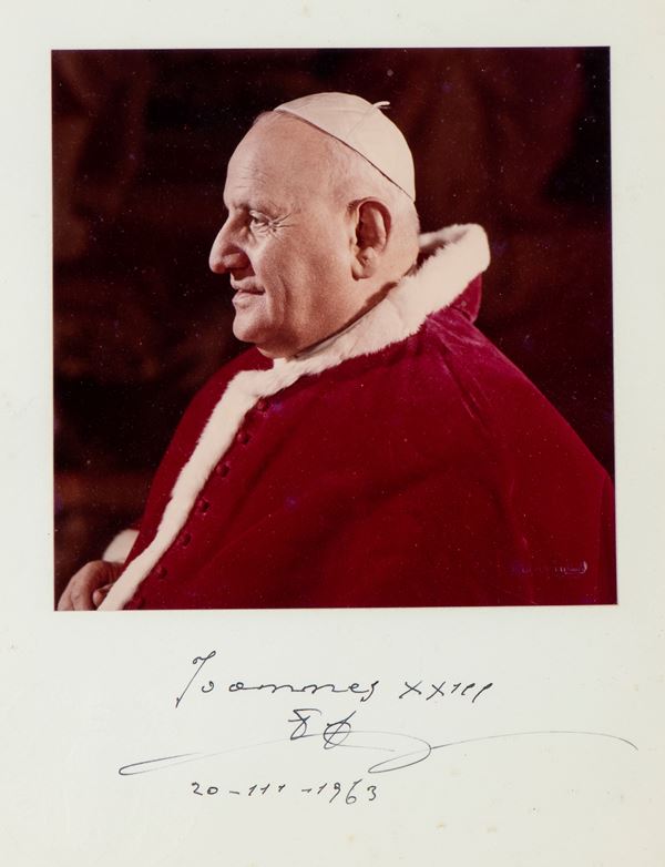 Half-length color photo of S.S. Pope John XXIII with handwritten signature in black ink of the pontiff, dated 20 March 1963