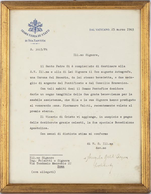 Together with the photo we find an official letter from the Secretariat of State of His Holiness, dated 25 March 1963, which certifies the gift of the photograph with the pontiff's signature to a couple of faithful.