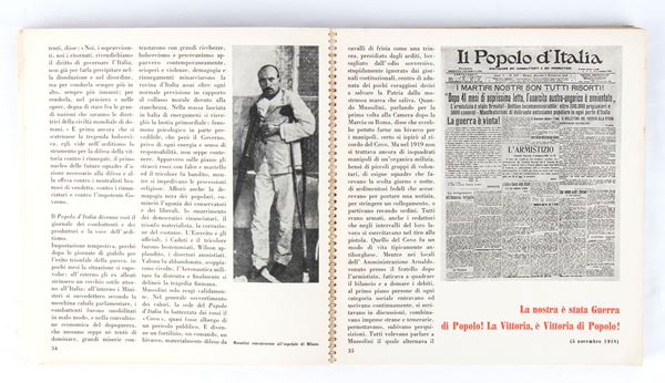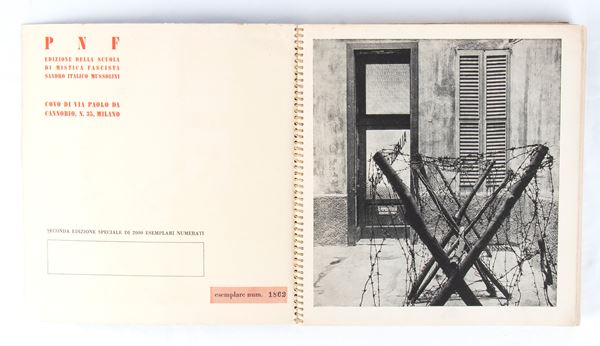 Volume published by the SANDRO ITALICO MUSSOLINI School of Fascist Mysticism. Layout by Giuseppe Pagano, graphic creation of the Raffaello Bertieri Institute, in Milan, 1940 year XVIII - In 8ยฐ square, approximately 24 x 24 cm, pp. 82, (4), editorial paperback with photographic illustration of the "covo" plates, text in red and black, entirely illustrated with b.w. photographs. in the text, spiral binding, pages folded Chinese style. Second special edition of 2000 numbered copies, this is no. 1862, but has no dedication.