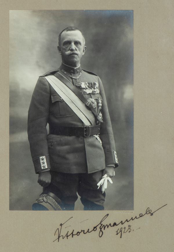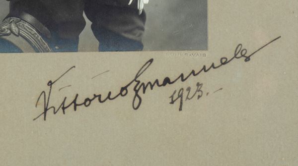 Full-length photo of King Vittorio Emanuele III, in full uniform, with handwritten signature, 1923
