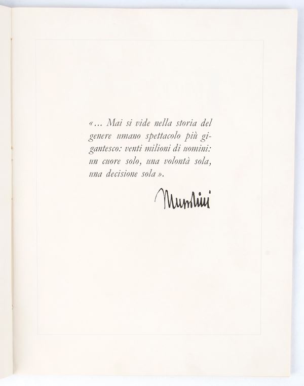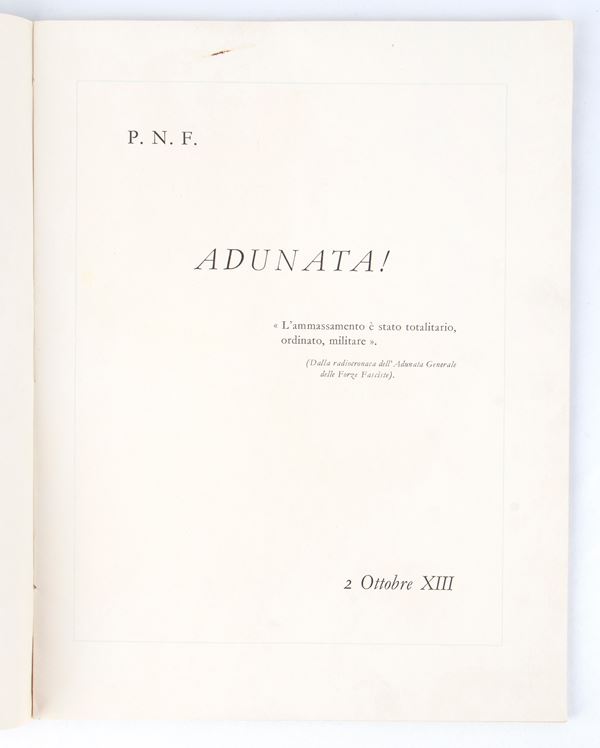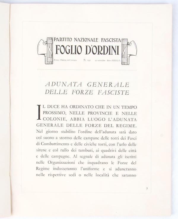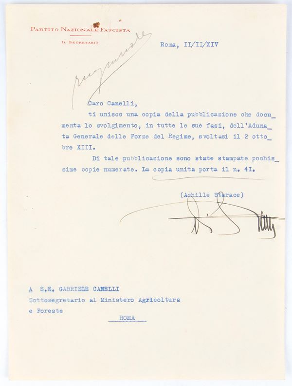 Special publication entitled GENERAL MEETING OF FASCIST FORCES which took place on 2 October 1934, in editorial paperback, "Printed in Rome in the workshops of the State Polygraphic Institute ... In Five Hundred Copies Numbered from 1 to 500" this is copy number 41 The volume is accompanied by a typed letter from the Secretary of the National Fascist Party, dated "II / II / XIV" and autographed by Achille Starace in black ink, certifying its numbering 41 to the recipient H.E. CANELLI Undersecretary at the Ministry of Agriculture and Forestry.