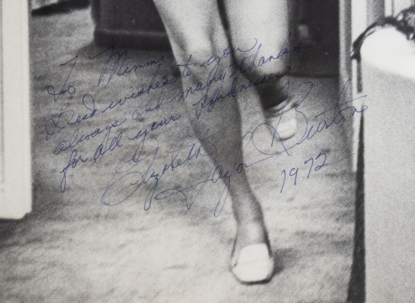Dedication and autograph signature “To Mimmo, Best wishes to you …”, in which the actress signs with the surname of her then husband Richard Burton. The photo of her running towards the camera is stunning.