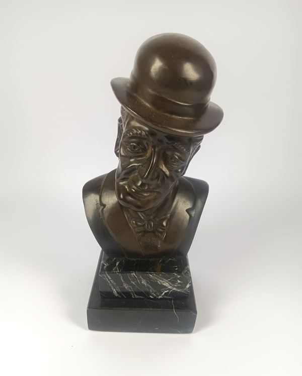 Bronze bust of Totò with his usual bowler hat by the Neapolitan master sculptor Antonio Januario. The bronze is signed and has a double base in real black marble.
