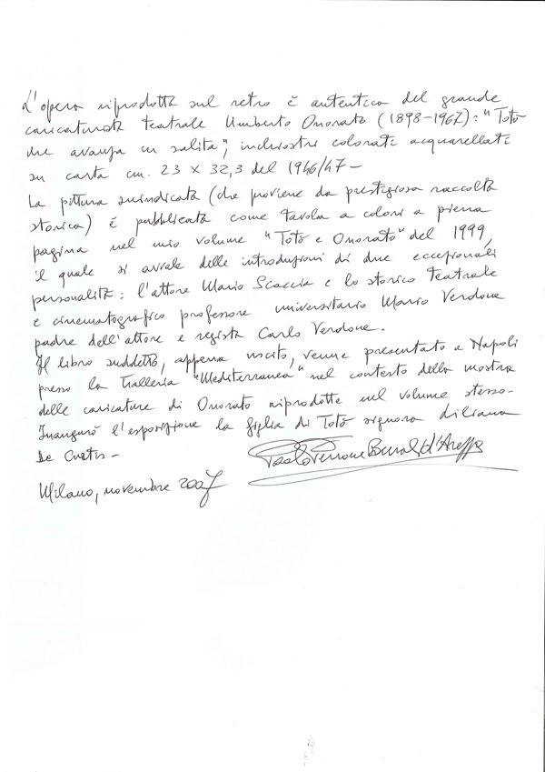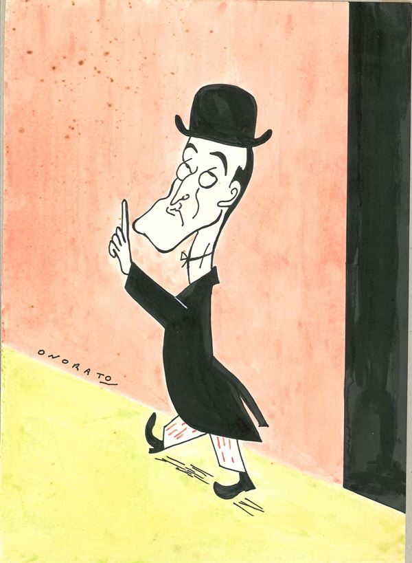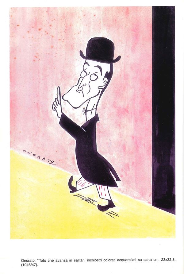 Original work by ONORATO entitled "Totò advancing uphill", colored inks watercolored on paper.