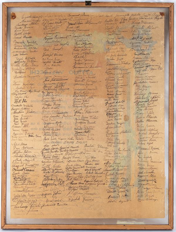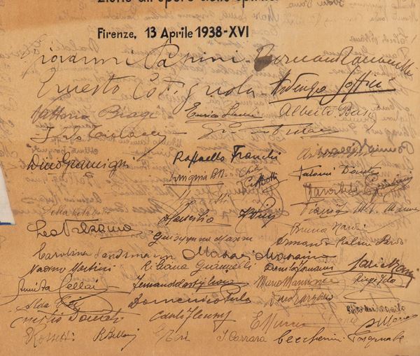 Sheet of parchment paper, hand-painted, donated to Attilio Vallecchi by his workers, employees, and writers with the text that reads "To Attilio Vallecchi, Cavaliere del Lavoro, they offer with happy and united spirit this image, which in the light of gold wants signify the warmth of affection - the Workers who feel him to be a loving father; the Employees who recognize him as a patient friend; the Writers who know his fraternal loyalty and his heroic devotion to the works of the spirit. Florence, 13 April 1938 - XVI" - Followed by a large number of autographs written in black ink where Giovanni Papini, Ernesto Codignola, Ardengo Soffici can be recognised. In a double-glazed frame, parchment measures approximately 37x50 cm. In excellent condition