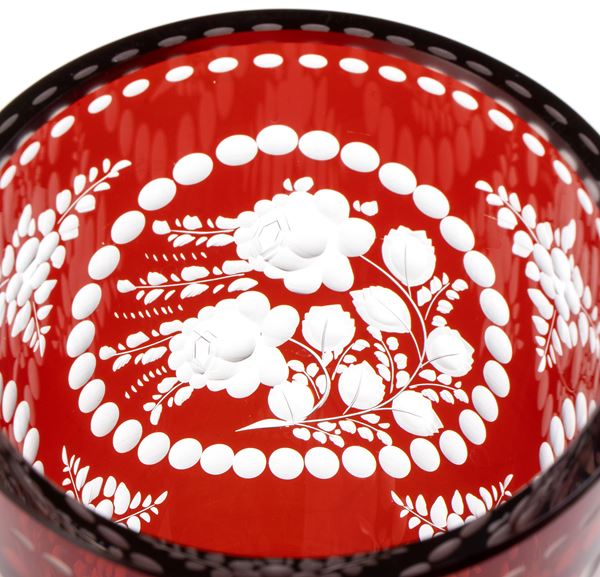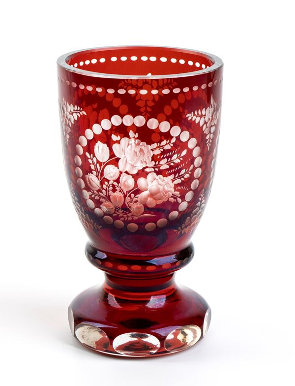 Ruby-coloured, cut and engraved with floral decorations in Biedermeier style.