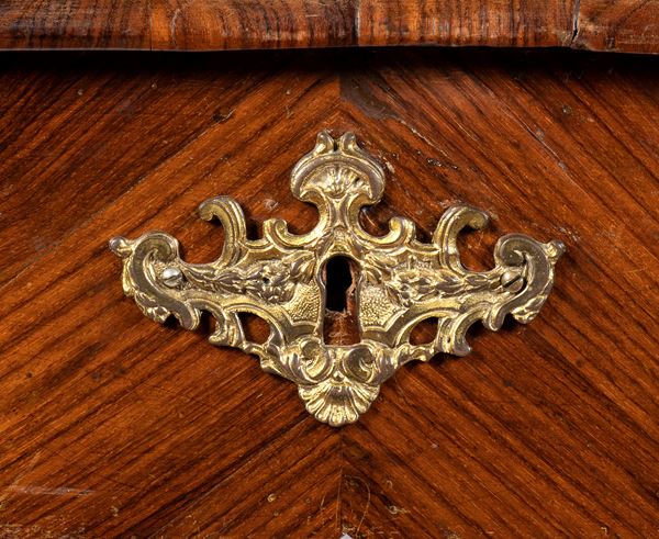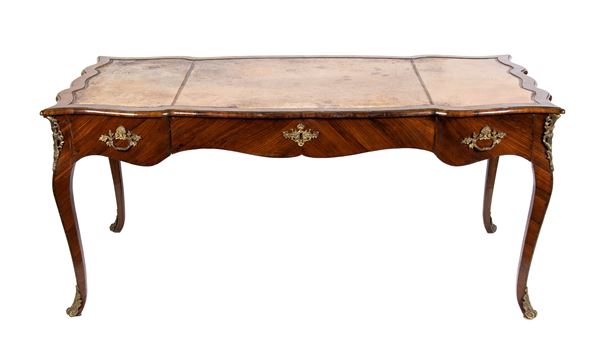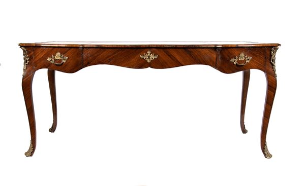 In purple ebony wood. Tobacco-coloured leather top in fair condition in three segments. Sabre legs gilt bronze handles and fittings from the period. The armchair (1970s reproduction) in English green leather in fair condition.