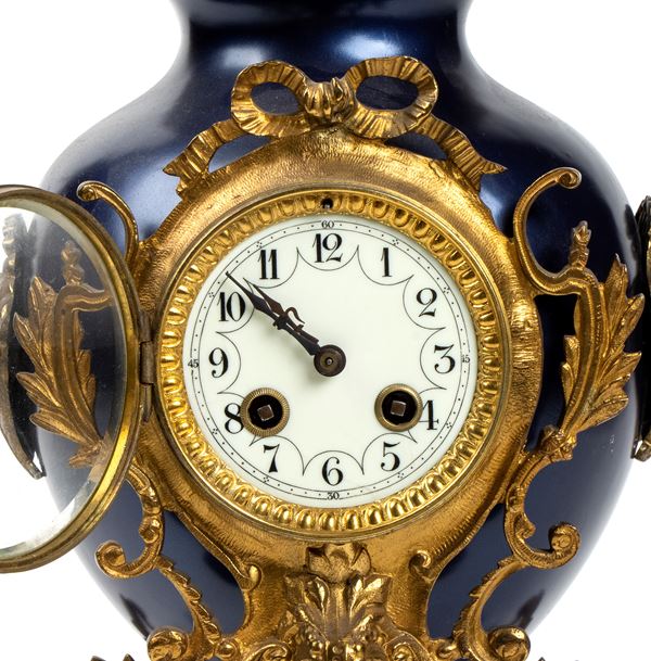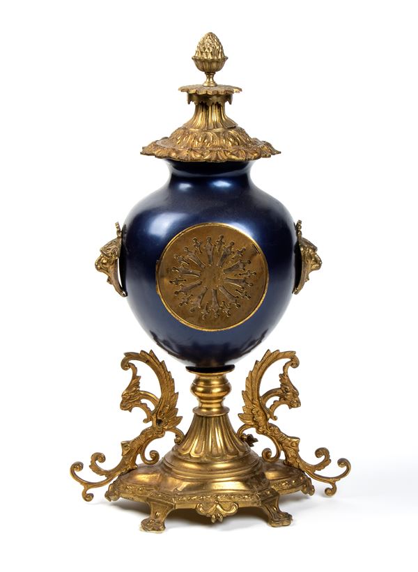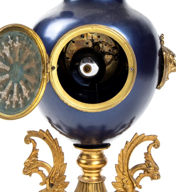 gilded bronze base with foour foliate feet and sides griffins, above which is a metal vase lacquered in the shades of blue topped with a by a lid with pine cone final. White enamel dial with Arabic numerals, movement with pendulum regulator and hour and half-hour chime on a bell.