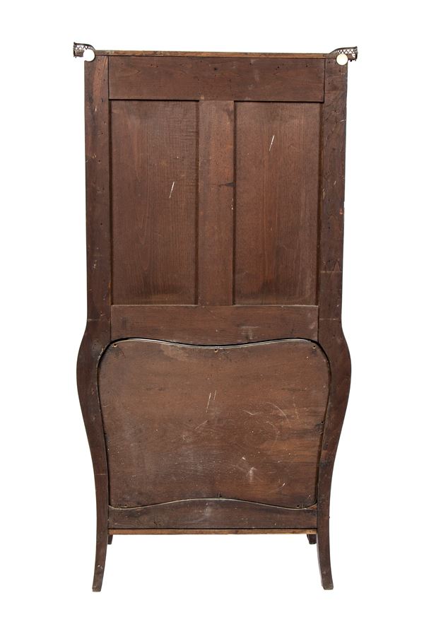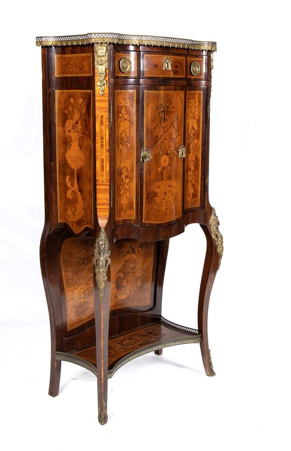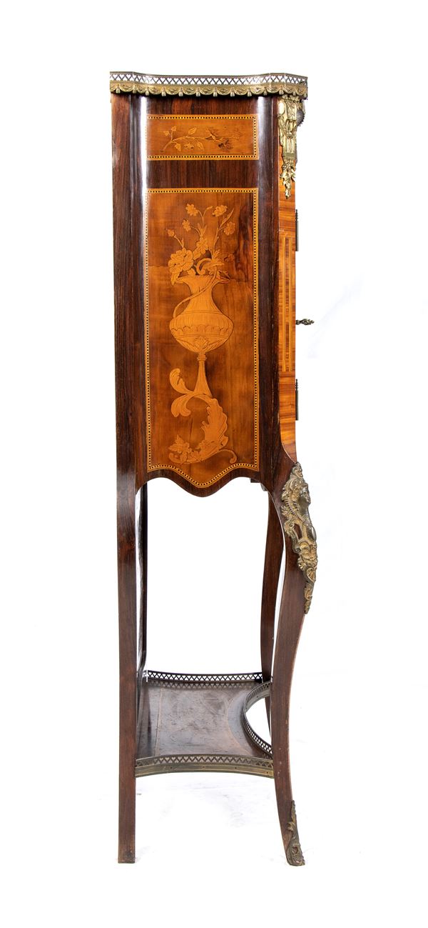made of rosewood , purple ebony and maple ,inlaid with floral motifs using firelight technique and with chiseled bronze appliqués.