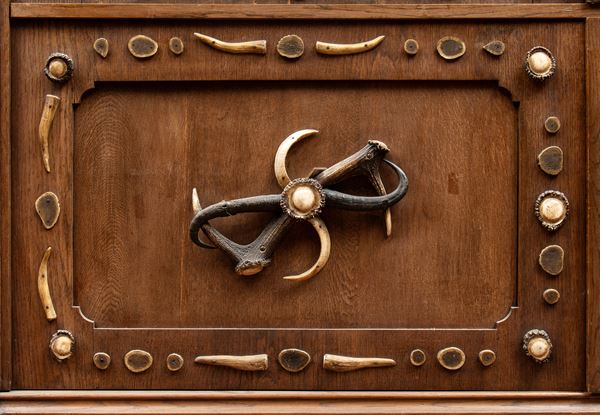 large black oak forest sideboard with applied antlers and antler sections of deer, roe deer, ibex, and wild boar defenses. Germany early 1900s