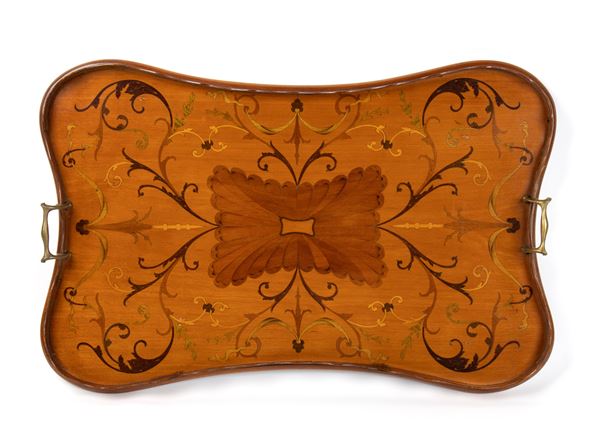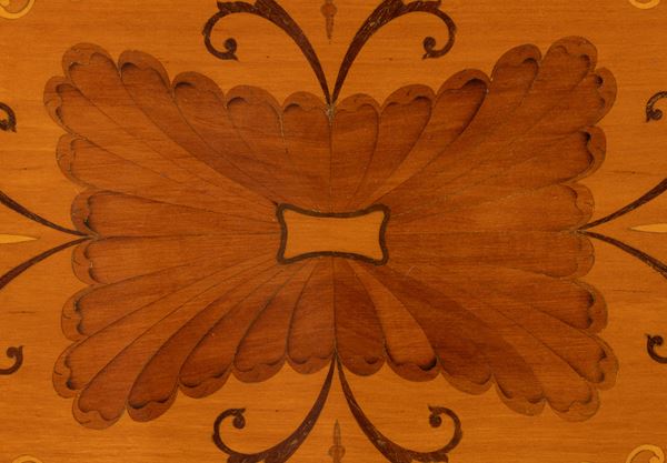 in satinwood, mahogany, and inlaid in fruitwood with floral motifs, in full Georgian style .Pair of brass handles and light mahogany riser connecting the entire perimeter.
