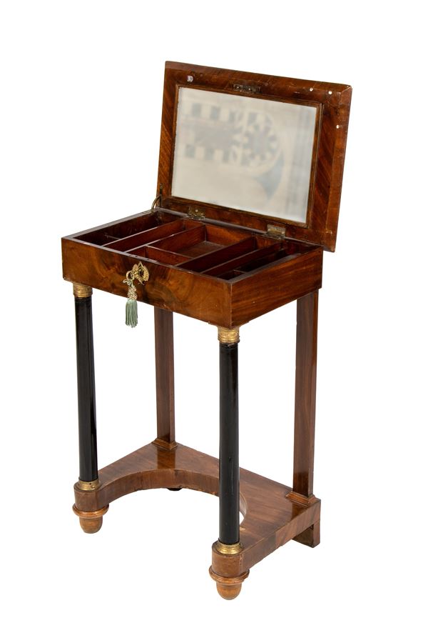 walnut wood, folding top concealing compartments and mirror inside top. Ebony parts with bronze capitals.