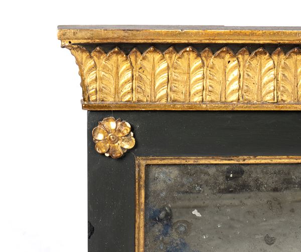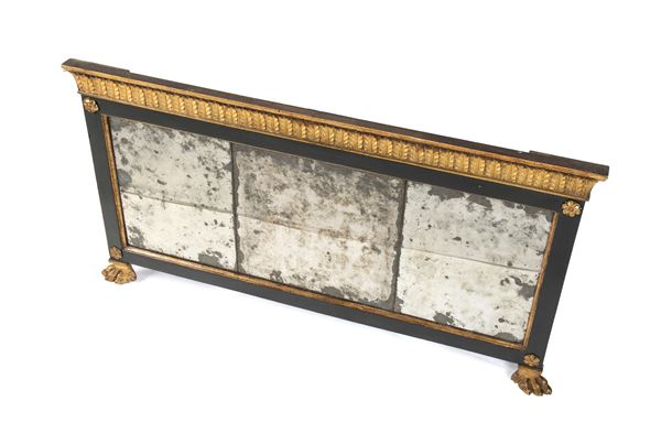 made with three mirrors, one flush with the other, from the Lucca area the ebonised wood frame with carved and gilded frames, at the base there are carved and gilded lion feet.