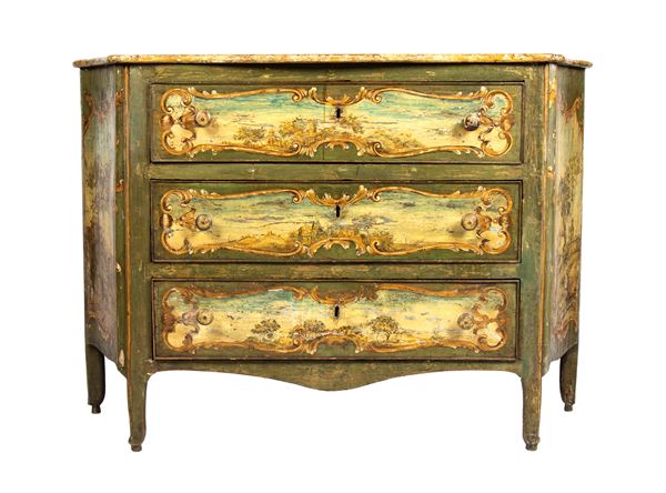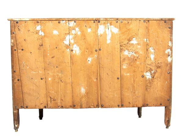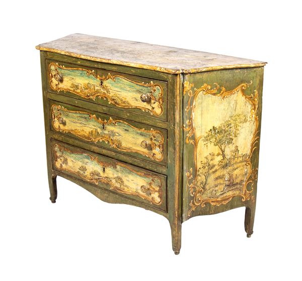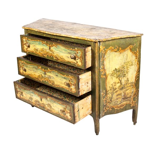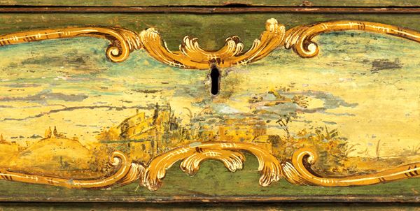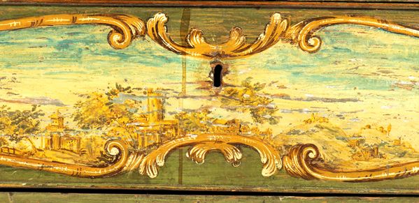 Notched poplar wood interior painted on the top and all sides with landscapes of the area of origin. Three drawers on the front individually painted with wooden knob handles (not coeval with the furniture). Slightly wavy legs.