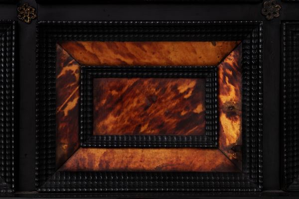 purple ebony, carob, ebonized wood, and tortoiseshell. From noble Sicilian family. Consists of 20 drawers; the base, not coeval but of later date, can be dated to the 19th century.