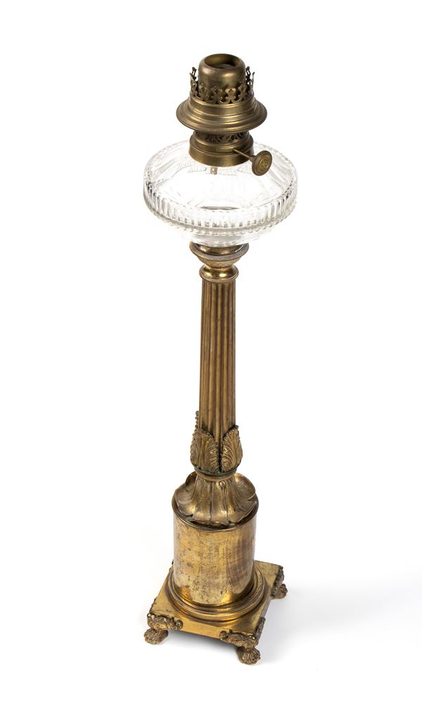 chiseled lamp in gilt bronze, glass oil reservoir, on the flame adjustment knob we find the trademark.