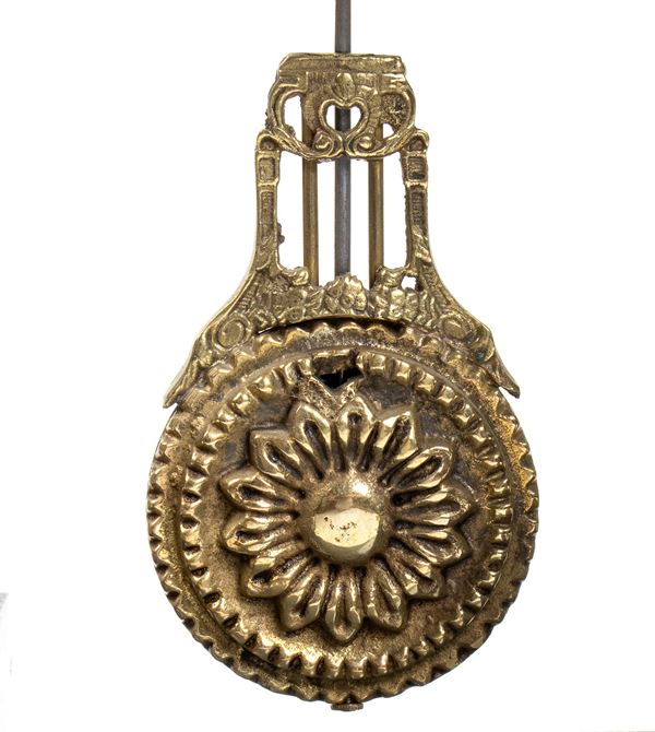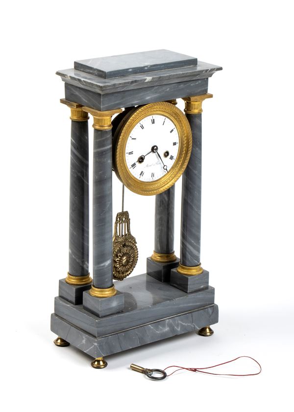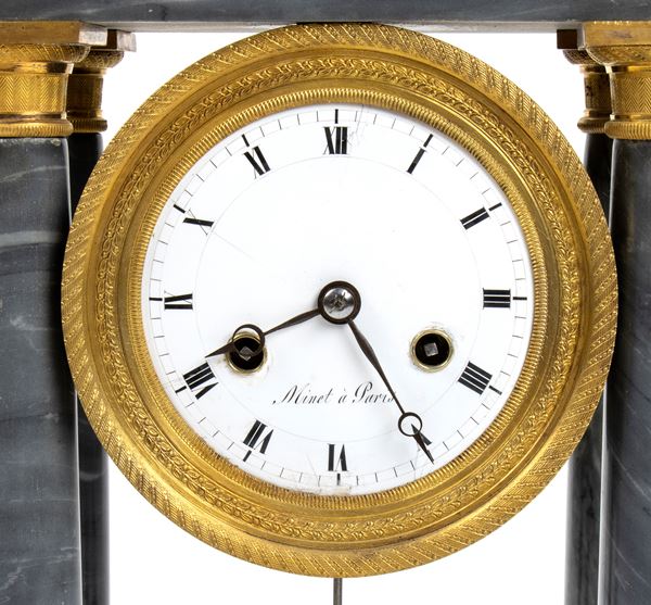 Rare bardiglio grey marble clock with with gilded and chased bronze applications. White enamel circular dial with Roman numerals signed 'Minet ร Paris', movement with wire suspension, pendulum regulator, and hour and half-hour chime on bell.
