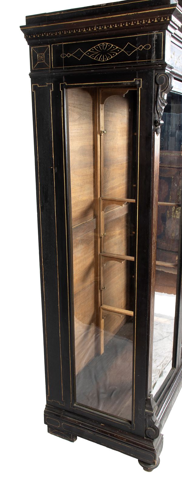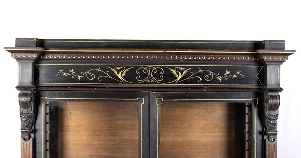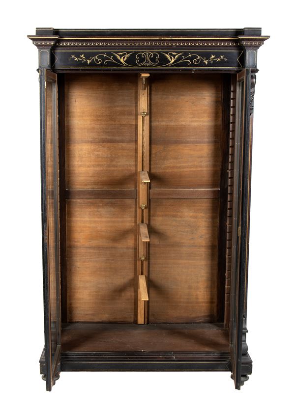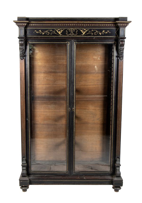 black lacquer and gold engravings, exposed glass also on the sides up to the base. Possibility of inserting wood tops, not present. Provenance southern Italy.