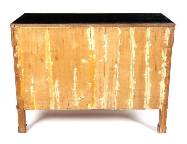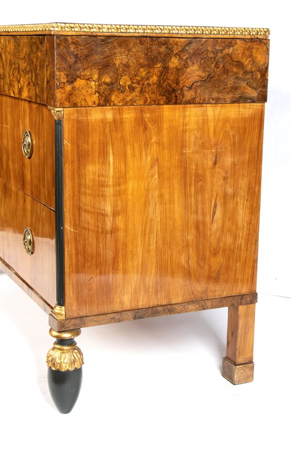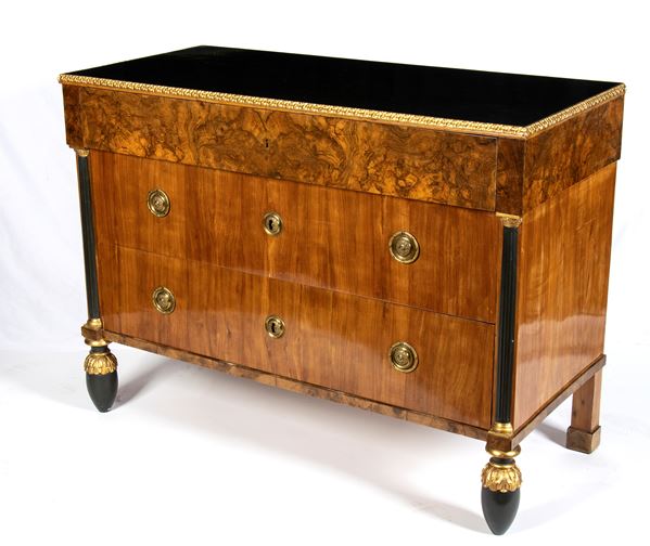 with three-drawer chest with a veneered walnut top drawer, featuring columnar supports adorned with gilded and carved black lacquered capitals. The black lacquered top showcases a carved and gilded frame, while the pine cone feet feature gilded leaf carving. Handles and escutcheons cover are crafted in gilded bronze.