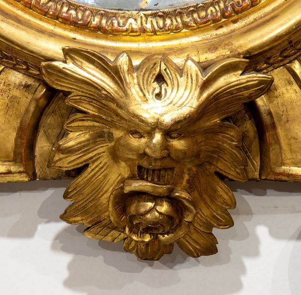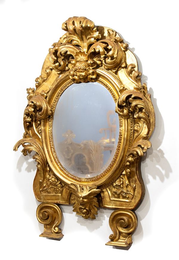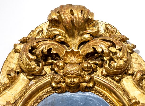 gilded wood mirror, city of Rome, Louis XV period, finely carved with bambocci, masks and floral motifs.