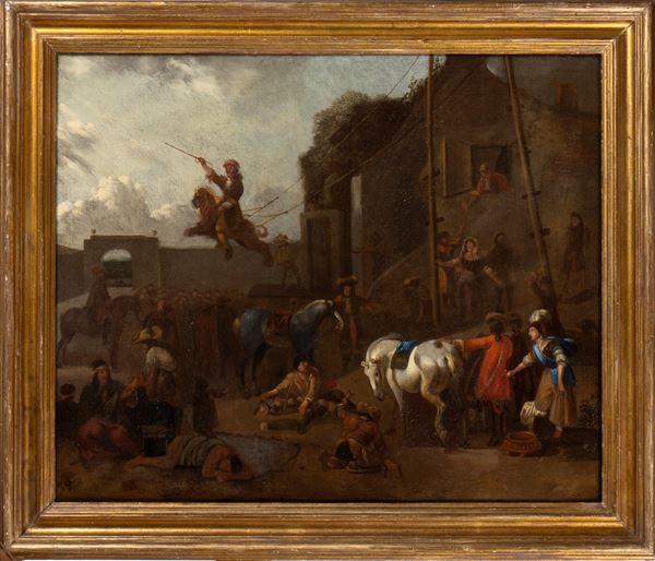 oil on canvas depicting a party with circus activity in a village, Flemish school circle of Jan Miel , known as John Miel or also John of the Vine(1599-1663). Coeval frame.