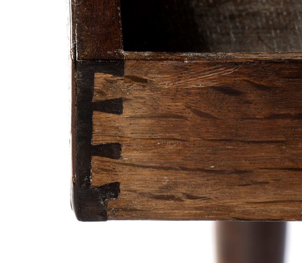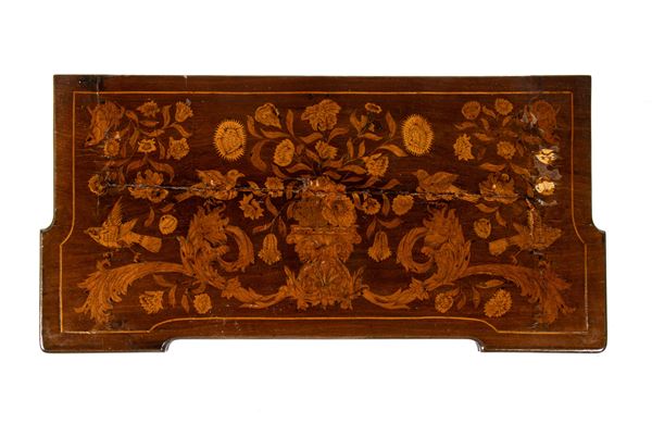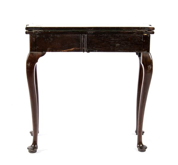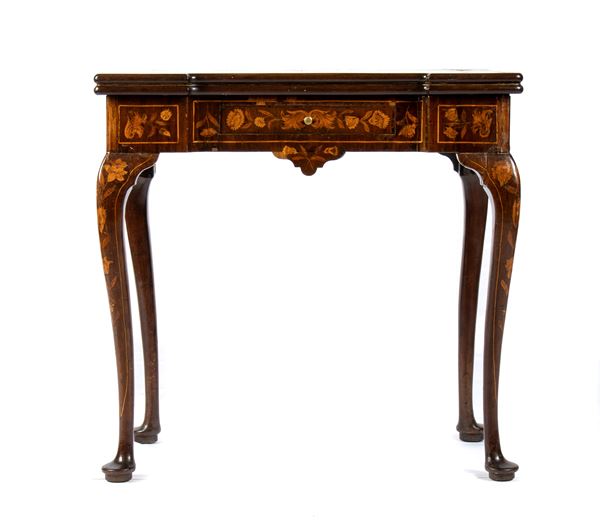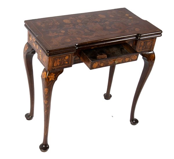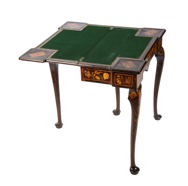 Mahogany card table inlaid with boxwood with floral motifs on the outside and playing cards on the inside and corners. The top is tilting with a swinging leg for support. It features a central drawer.