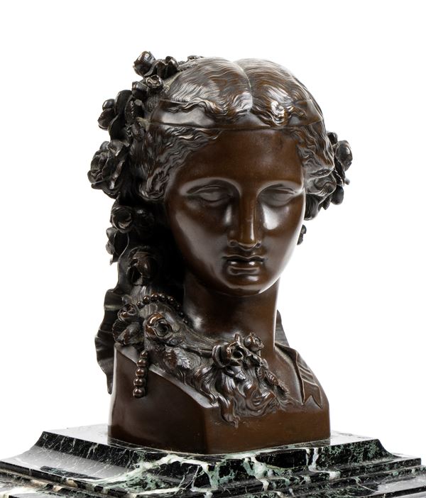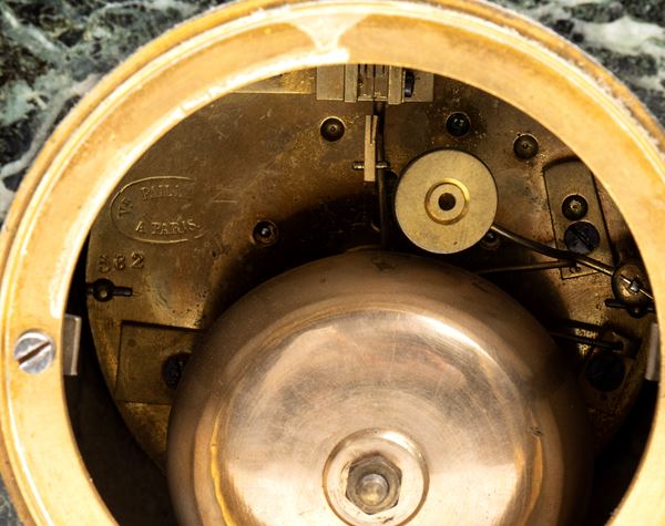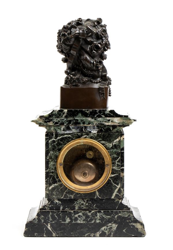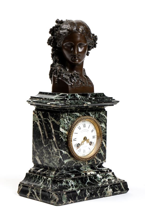 alps green marble base, above which is a patinated bronze bust of a young woman. Circular white enamel dial with Arabic numerals and two winding holes, spring-suspended movement with pendulum regulator and hour and half-hour strike on bell signed "V. Paillard". Victor Paillard (1805-1886), one of the greatest bronze craftsmen of the 19th century, founded his house of bronzes and furniture in 1835 and won the gold medal at the St. Petersburg Exhibition in 1849 and the London Exhibition in 1851.