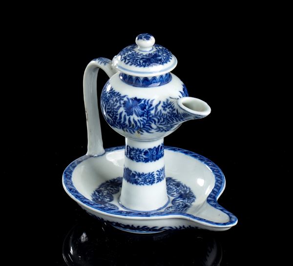 The object is made up of a lamp-shaped container surmounted by a lowered lid with a knob-shaped finial, the handle on the back joining to the shaped tray, the cobalt blue decoration consisting of floral arabesques, apocryphal Qianlong mark to the center of the base.