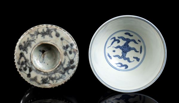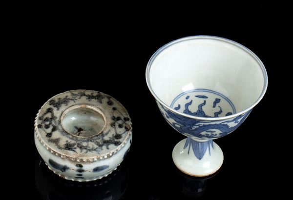 A 'BLUE AND WHITE' PORCELAIN STEM CUP AND A COMPASS HOLDER