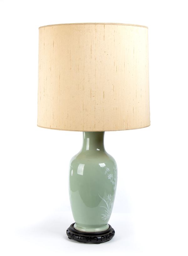 A CÉLADON GLAZED AND SLIP DECORATED PORCELAIN BALUSTER VASE MOUNTED AS A LAMP