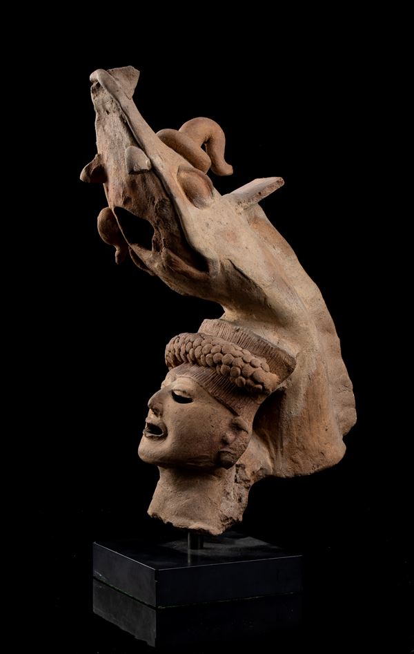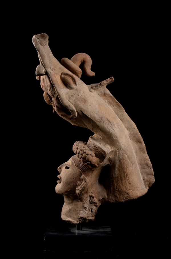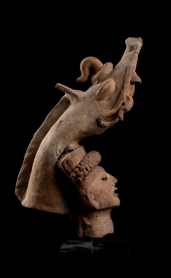 A CLAY WARRIOR HEAD WITH SNAKE HEADDRESS