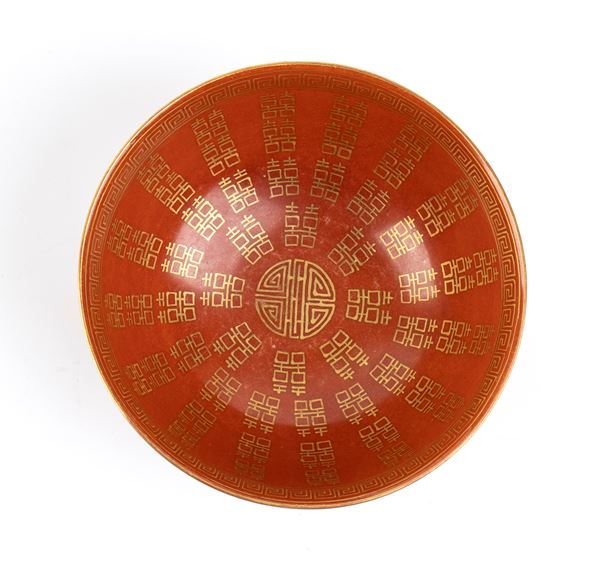 A GILT-DECORATED CORAL-GROUND PORCELAIN BOWL