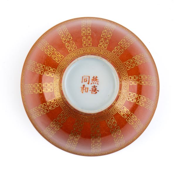 The exterior with a decoration of shou ("long life") characters on a coral ground, 燕喜同和 (Yangxi tonghe) mark to the center of the base.