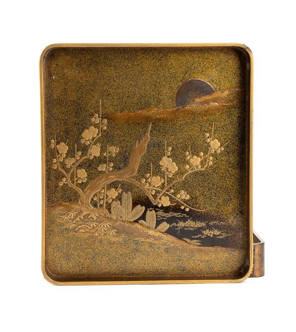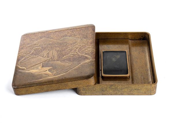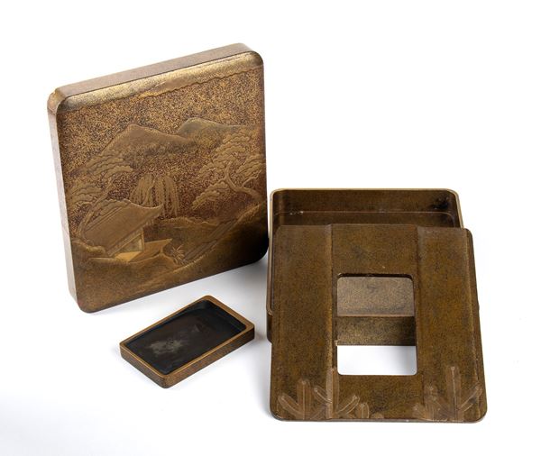 Finely decorated in gold lacquer maki-e ("sprinkled painting") with landscape scenes.