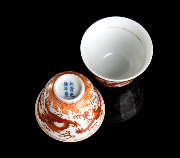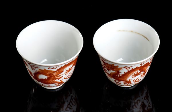 A PAIR OF SMALL IRON RED ENAMELLED PORCELAIN CUPS