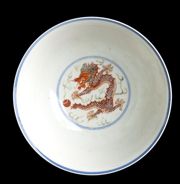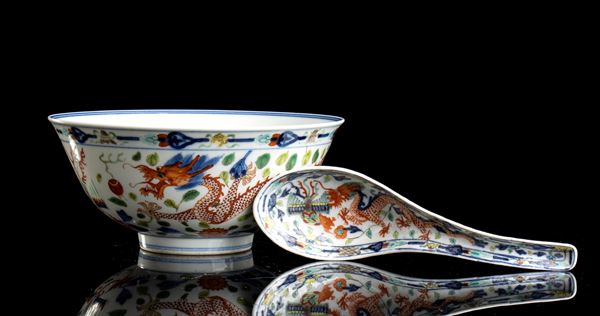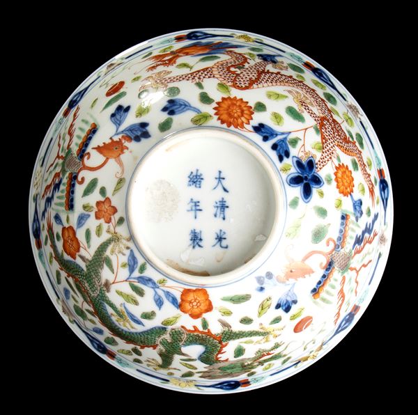 The two pieces decorated with exuberant compositions of dragons and phoenixes amidst flowers and leaves, 大清光绪年制 (Da Qing Guangxu nianzhi, “Made in the reign of Emperor Guangxu of the great Qing”) mark to the center of the base of the bowl.