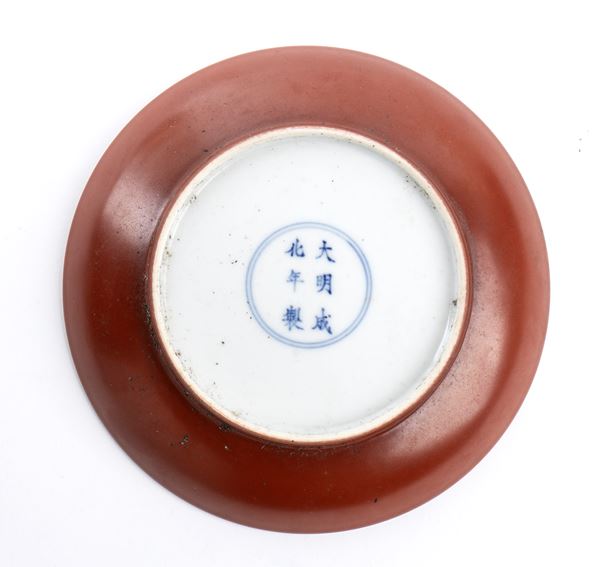 Dark red ground and large circular medallion with a floral composition, apocryphal Chenghua mark to the center of the base.