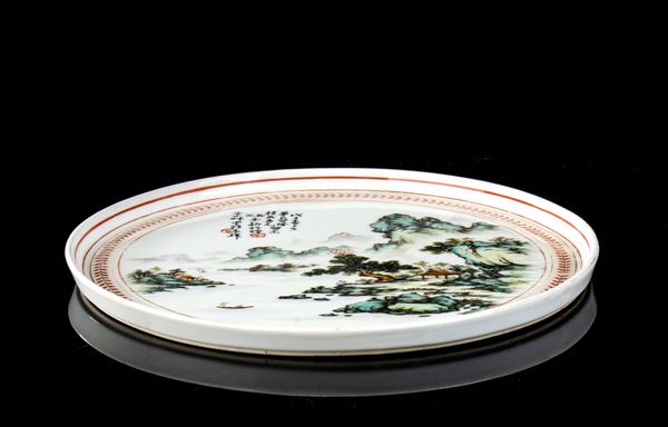 The decoration consisting of a lake landscape, top left inscription and signature with seals of Wang Xiaoting (1906-1970).