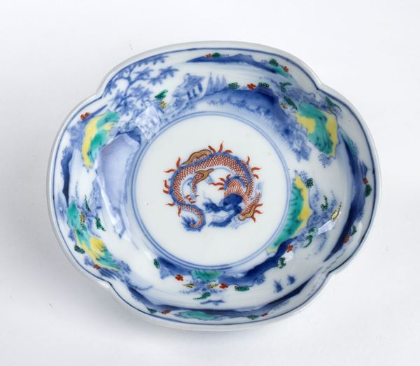 A POLYCHROME ENAMELLED PORCELAIN SHAPED BOWL