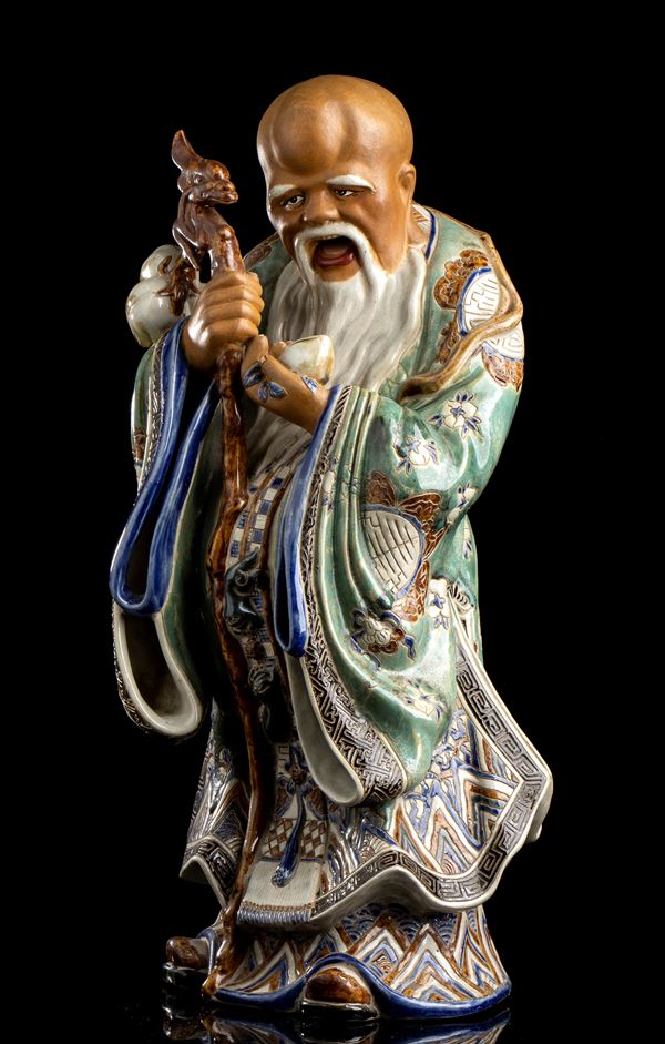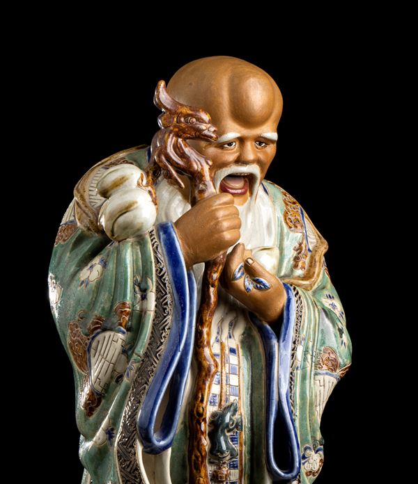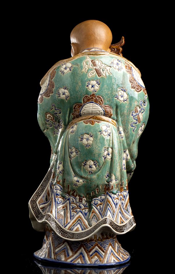 A POLYCHROME ENAMELLED PORCELAIN STANDING SHOULAO