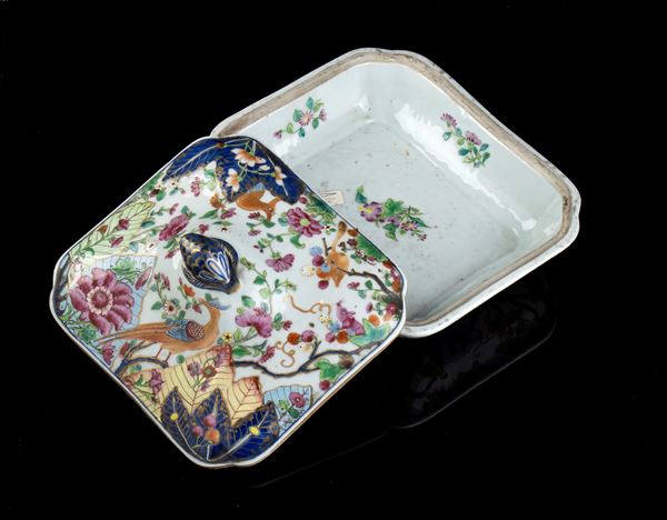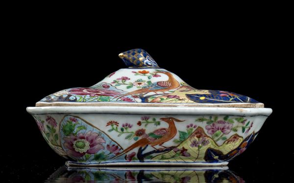 A POLYCHROME ENAMELLED PORCELAIN 'TOBACCO LEAF' TUREEN AND COVER