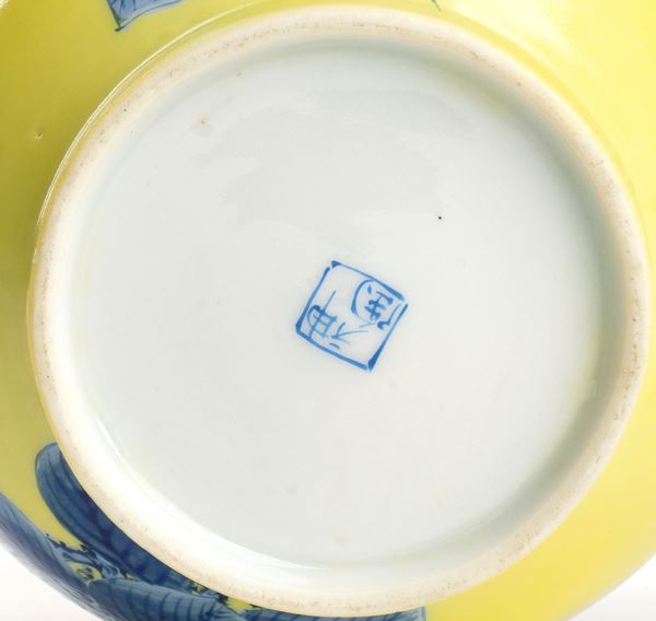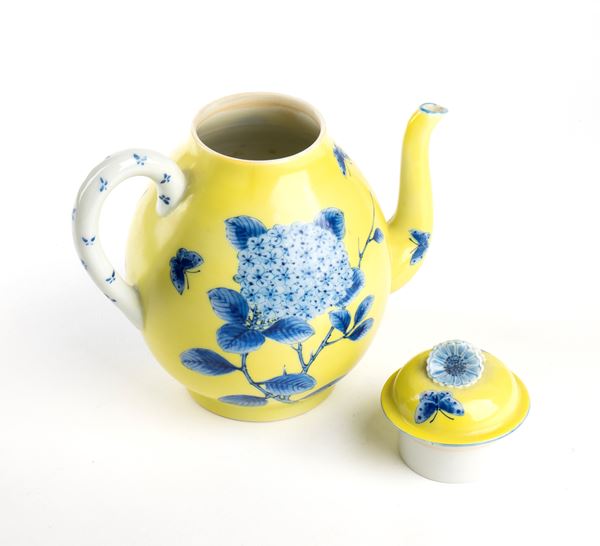 The underglaze blue decoration of flowers and butterflies reserved on a yellow ground, the finial of the lid modeled as two chrysanthemum corollas, red mark on the body and mark to the center of the base.