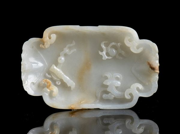 A SMALL WHITE AND RUST JADE TRAY