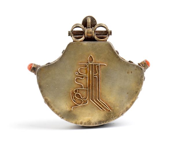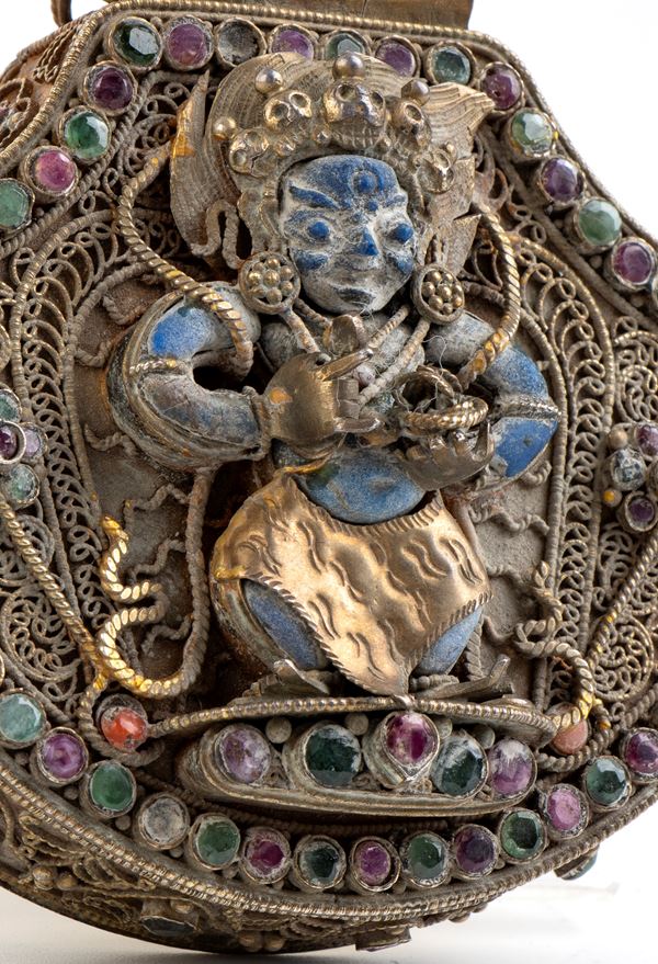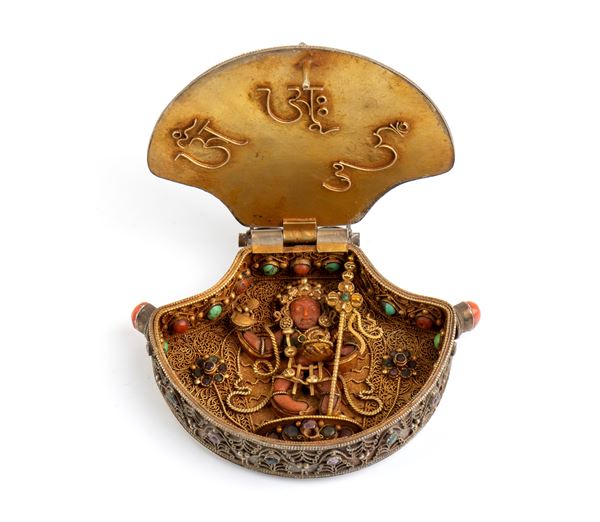 A CORAL AND HARDSTONES INLAID GILT SILVER GAU RELIQUARY